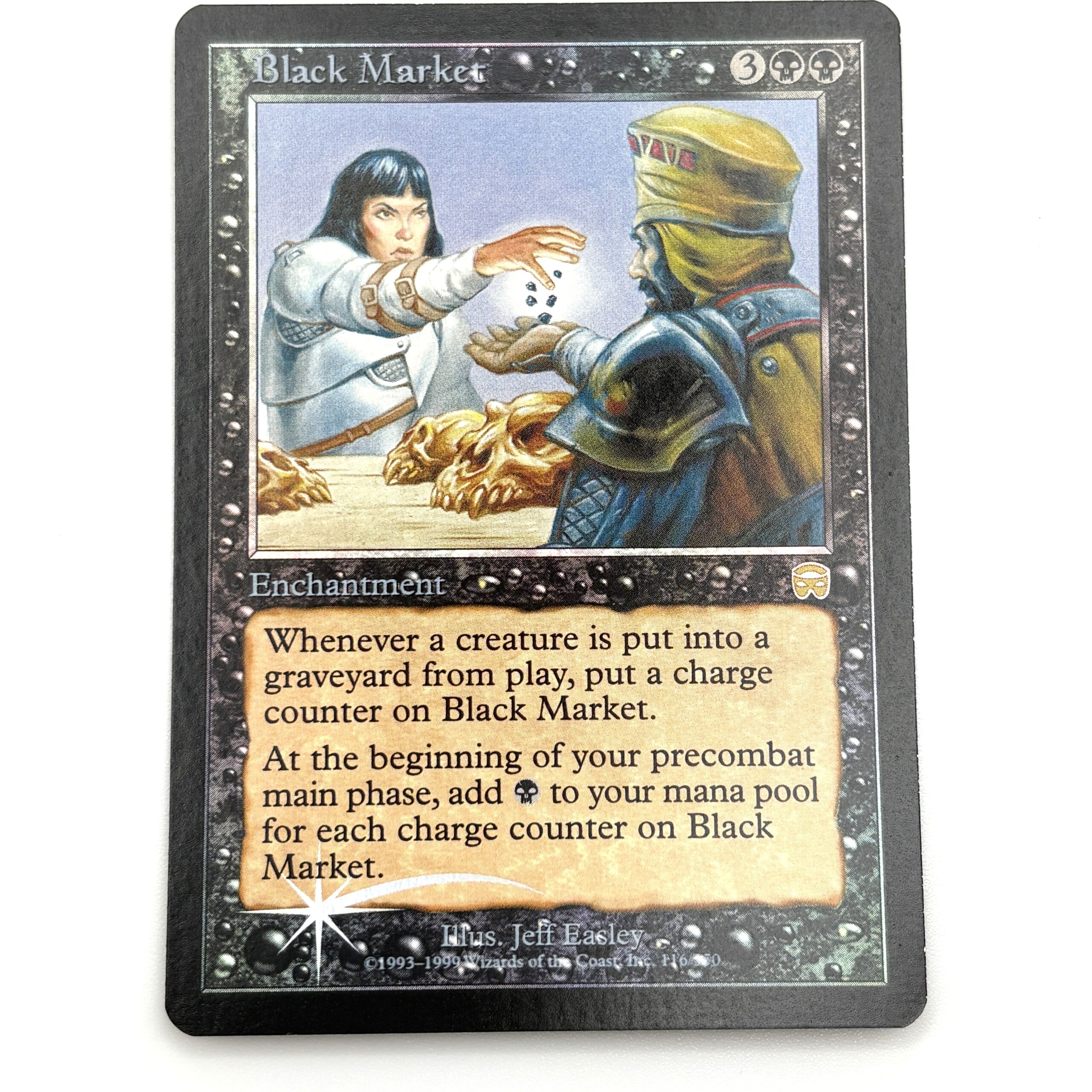…ということで1枚目は「闇市場/Black Market」でした!死亡したクリーチャーの分だけ蓄積カウンターが貯まり、その分だけ毎ターン黒マナを加えるカードですね。CANTRIPさんのサイトでは11,800円となっていました。