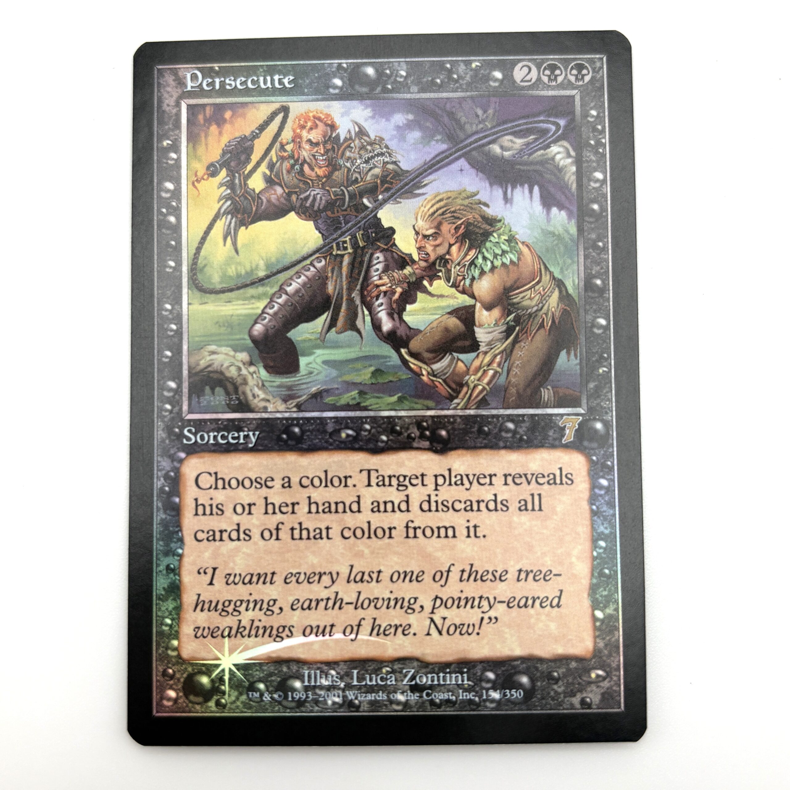 「迫害/Persecute」でした!1色選んでプレイヤーの手札からその色のカードを全て捨てさせる単色殺しなカードですね。CANTRIPさんのサイトでは17,800円となっていました。
