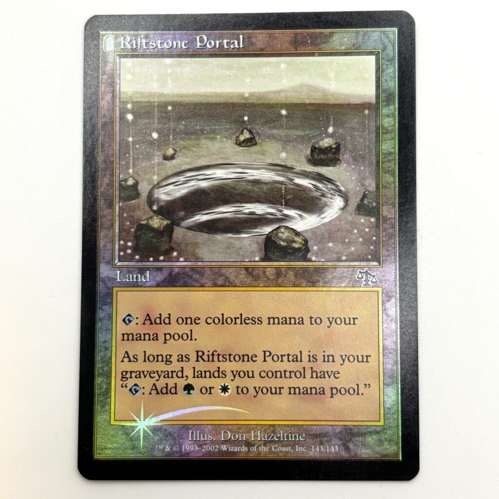 「裂け岩の扉/Riftstone Portal」は墓地にあるだけで自分の土地全てが緑・白マナを生み出すことができるようになる土地です。神秘的なイラストが魅力的ですね。