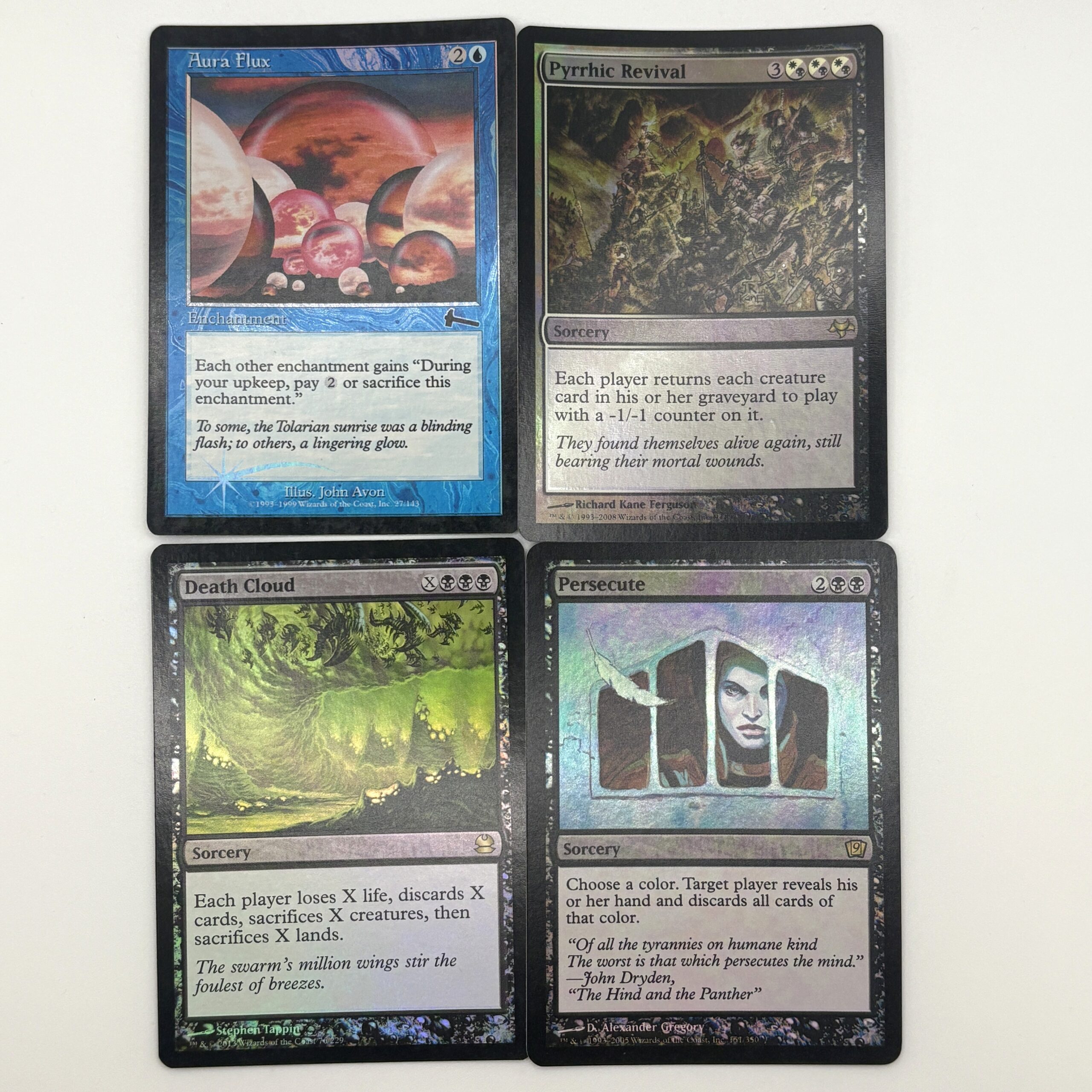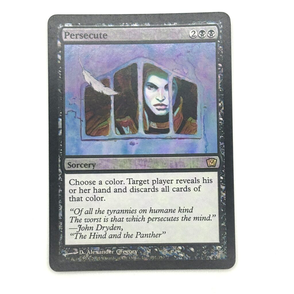 「迫害/Persecute」はプレイヤー1人を対象として選んだ色のカードを全て捨てさせます。単色デッキには致命的なダメージを与えられますね。イラストの壁の部分がfoil映えします。