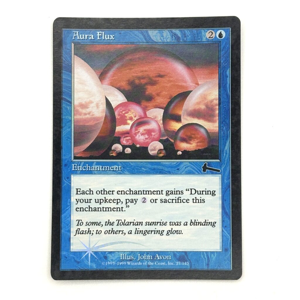 「オーラの変転/Aura Flux」はウルザズ・レガシーのカードですね。他のエンチャントに「自身のアップキープ時に2マナ払わない限り生け贄に捧げる」能力を付与する能力を持っています。イラストの神秘的な雰囲気が気に入ってます。