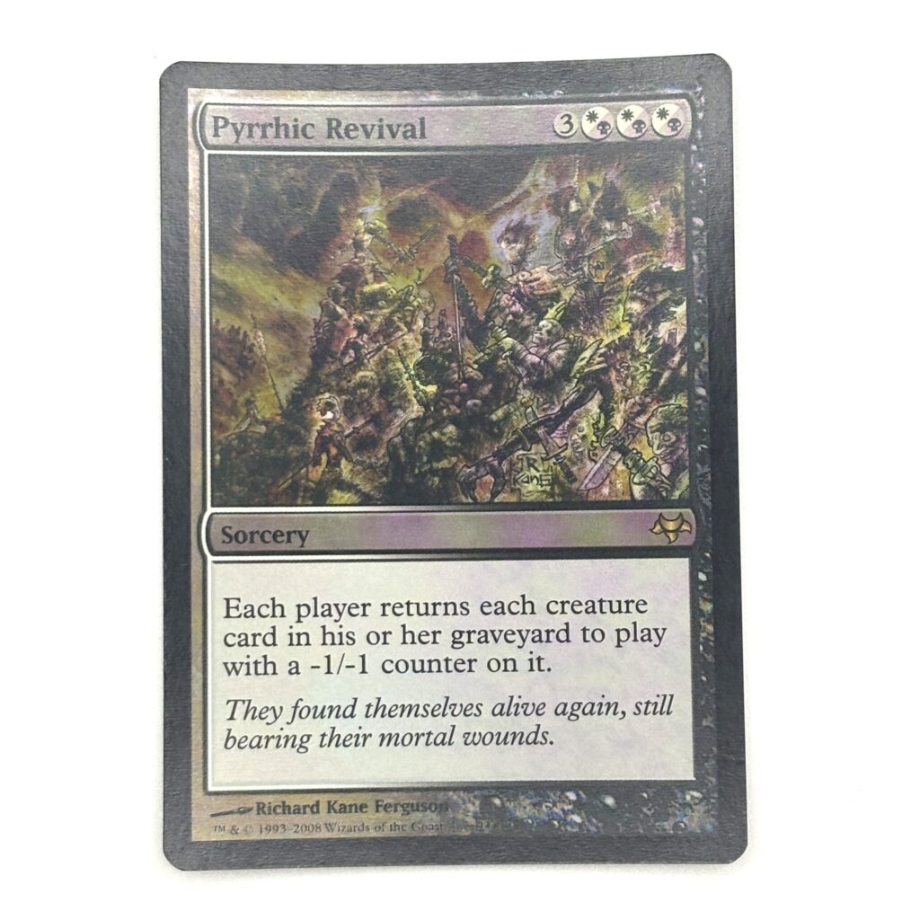 「戦舞いの蘇生/Pyrrhic Revival」は地獄絵図のようなイラストが良いですね。まさにイラストの通り各プレイヤーの墓地にあるクリーチャーカード全てを-1/-1カウンターを載せて戦場に戻す、楽しそうなカードです。