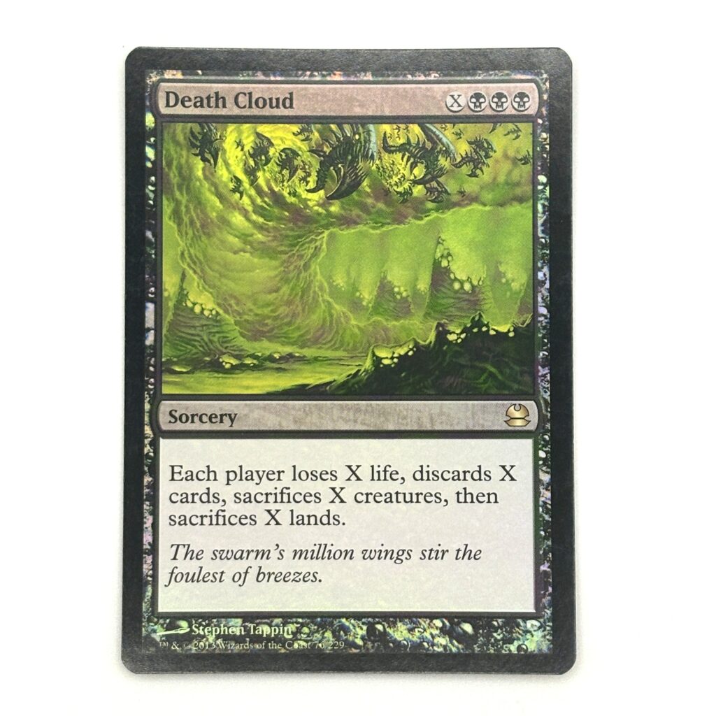 「死の雲/Death Cloud」は支払った追加マナの分だけ全プレイヤーのライフ・手札・クリーチャー・土地を削るカードです。黒の魅力とロマンが詰まったカードです。