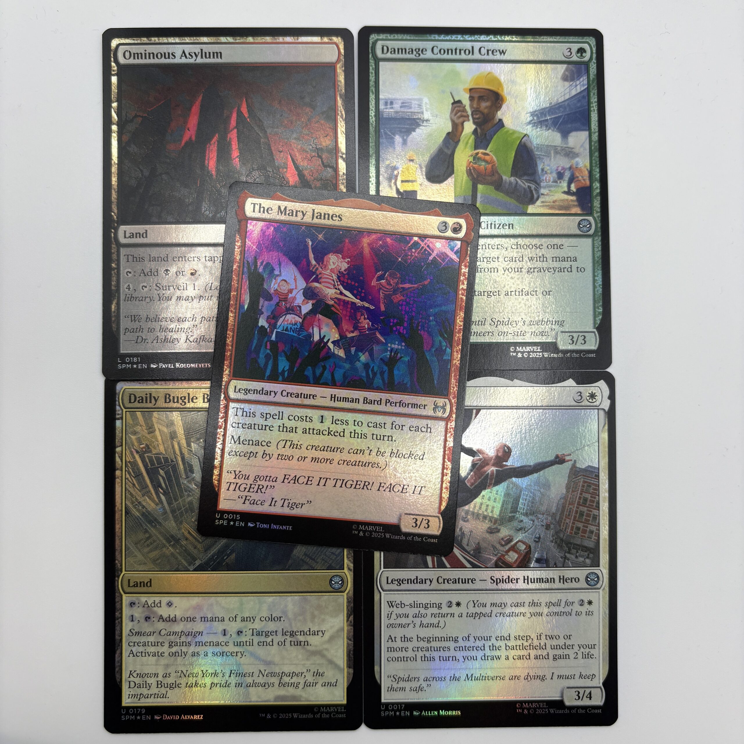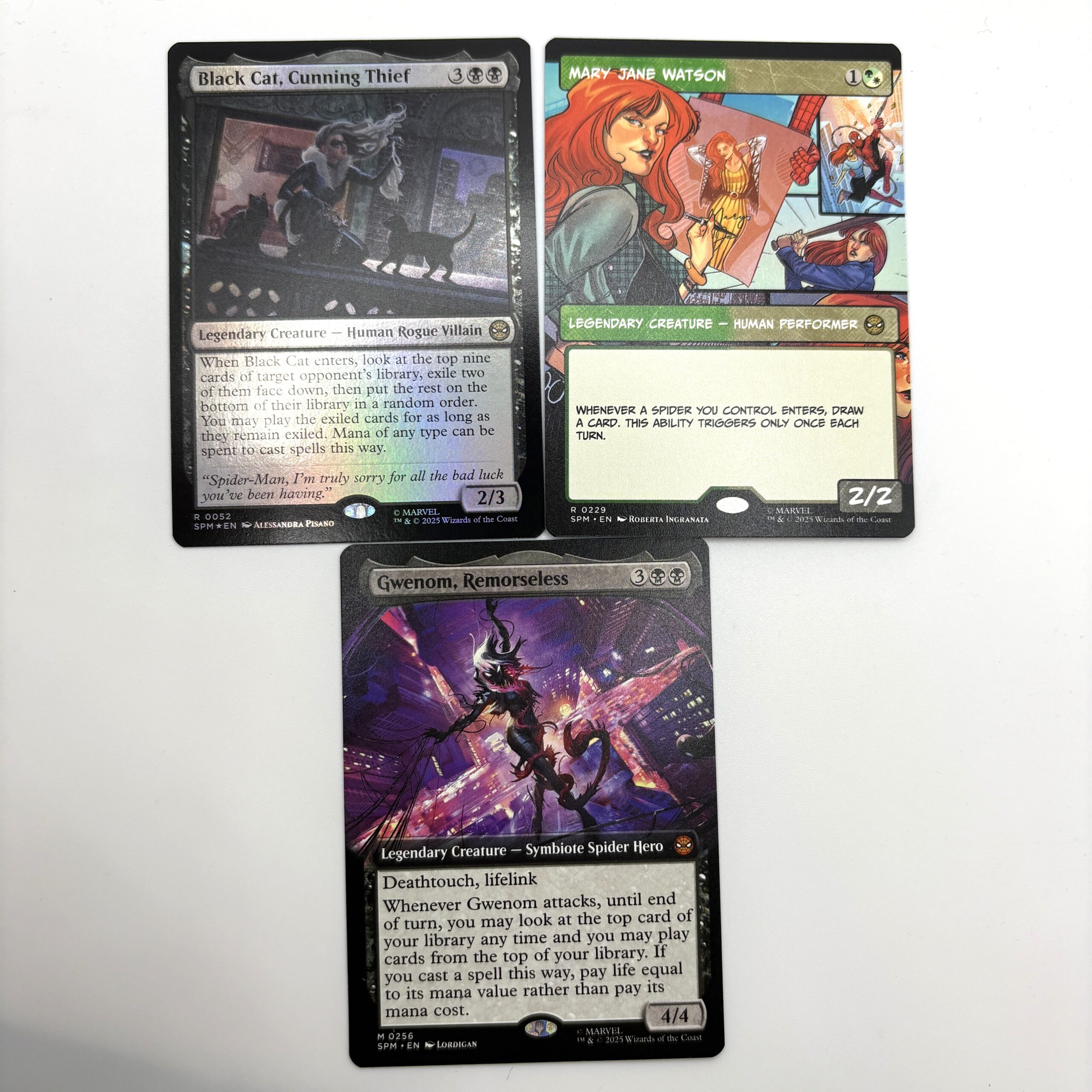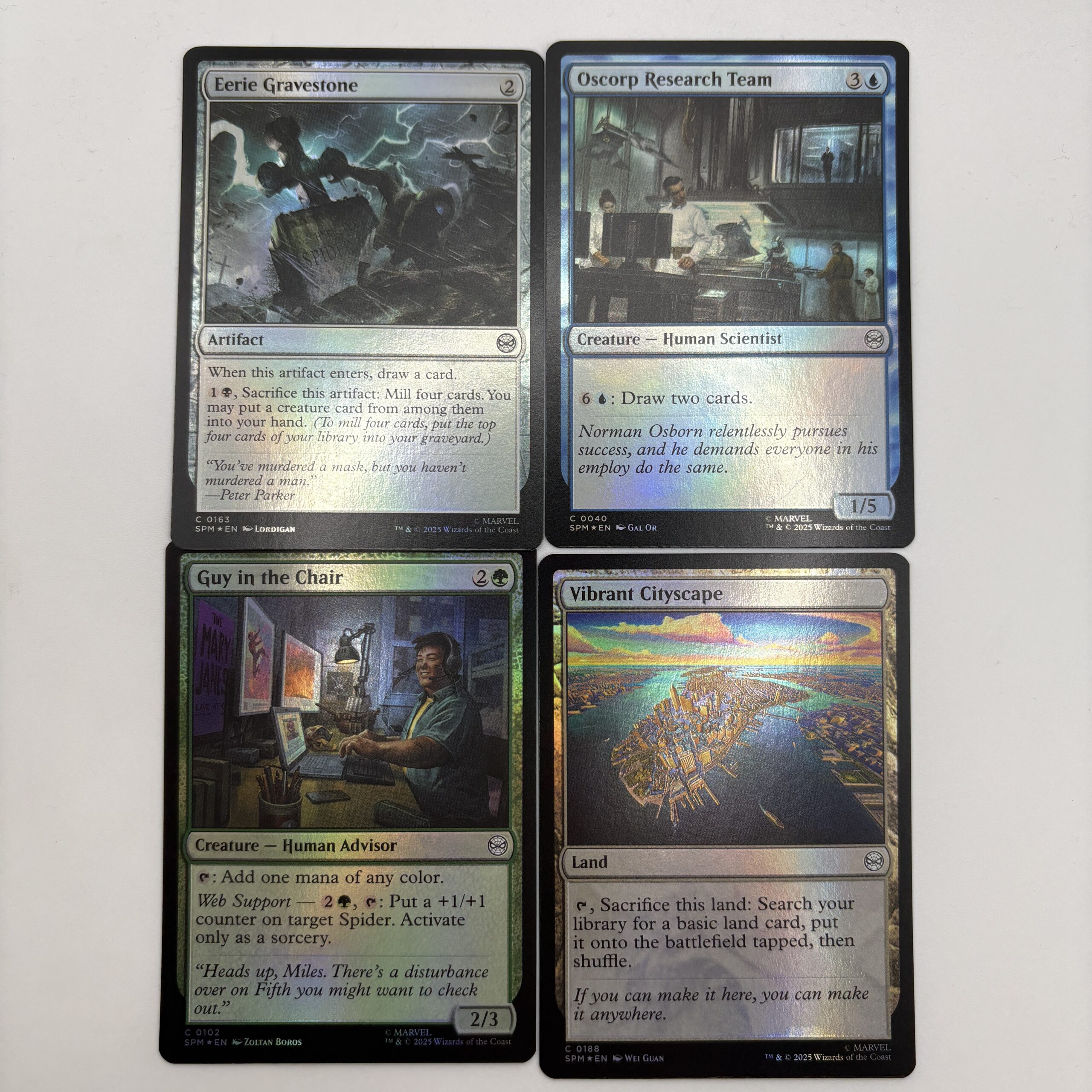 次に土地カードと下から2番目のレアリティが4枚ですね。「スパイダーマン」という単一の作品だけでこれだけキャラクターが居るのは凄いですね。